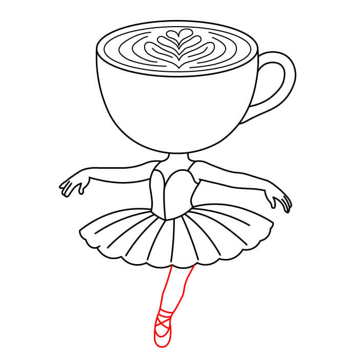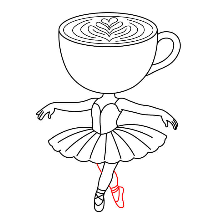 Zpod sukně veďte jednu štíhlou nohu směrem dolů. Na konci nakreslete baletní špičku se stuhami překříženými kolem kotníku.
