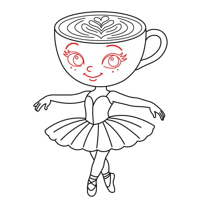 Na závěr vybarvěte kávu teplou hnědou barvou s bílým a krémovým latte art. Oblečení baleríny udělejte růžové – živůtek, tutu i baletní boty. Šálek a pokožku vybarvěte jemnou béžovou. Oči dokončete černou barvou s bílými odlesky.