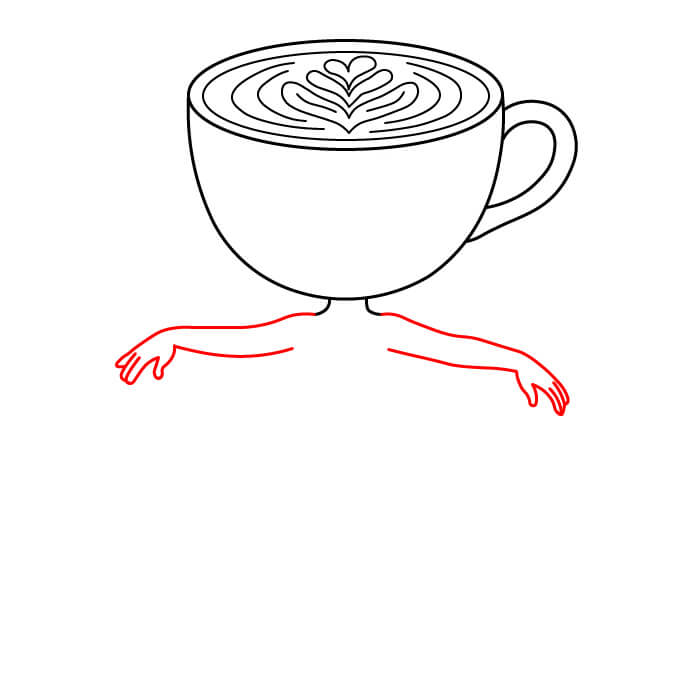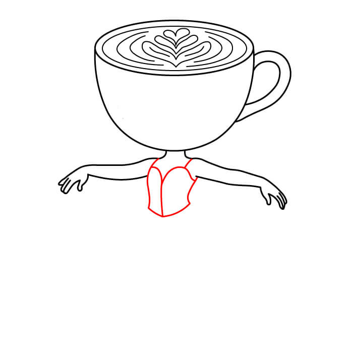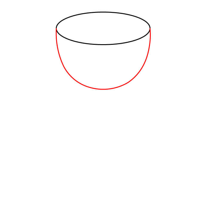 Pod oválem nakreslete hlubokou zakřivenou čáru, která vytvoří tělo šálku.