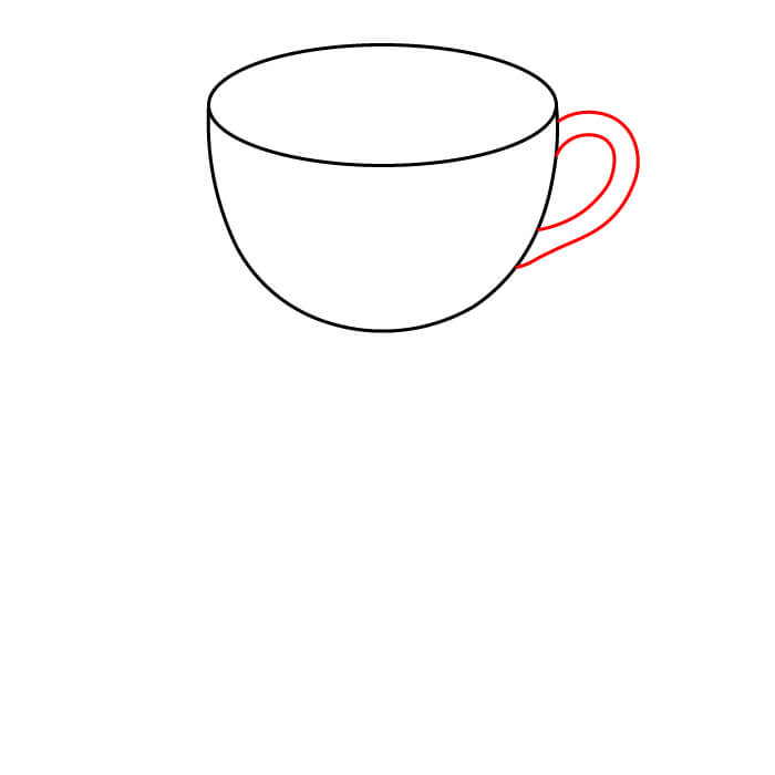 Na pravé straně šálku nakreslete zakřivené ouško ve tvaru písmene C. Použijte dvě rovnoběžné čáry, aby mělo určitou tloušťku.