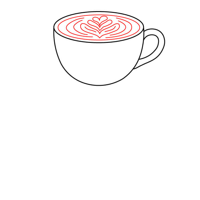 Uvnitř horního oválu nakreslete sérii vlnitých, do sebe vnořených srdíček a zakřivených čar, které vytvoří pěkný vzor latte art na pěně.