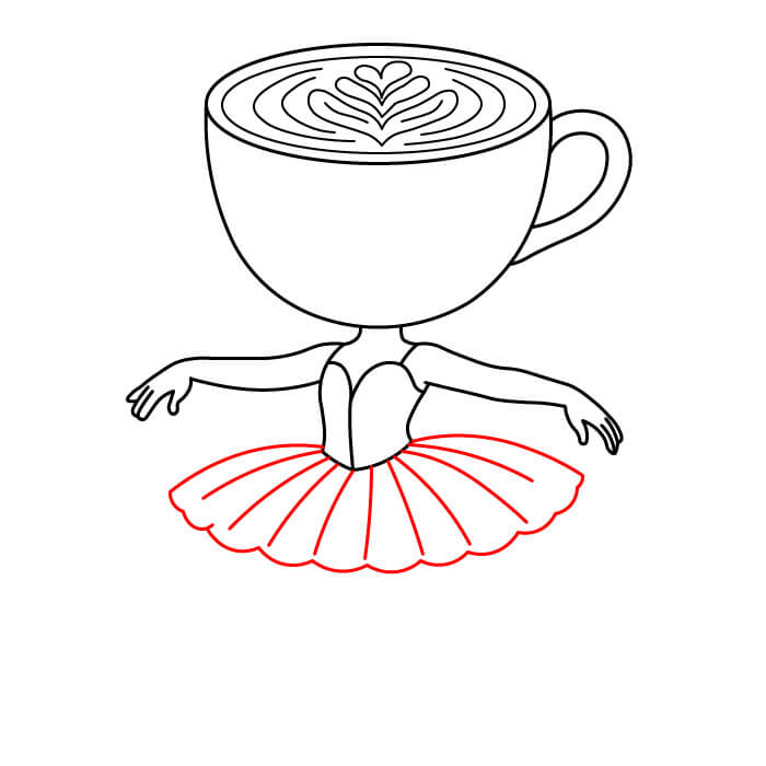 Pod živůtek nakreslete širokou, vrstvenou a nařasenou sukni (tutu). Přidejte několik krátkých svislých čar, aby bylo vidět vrstvení látky.