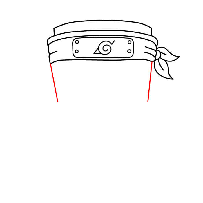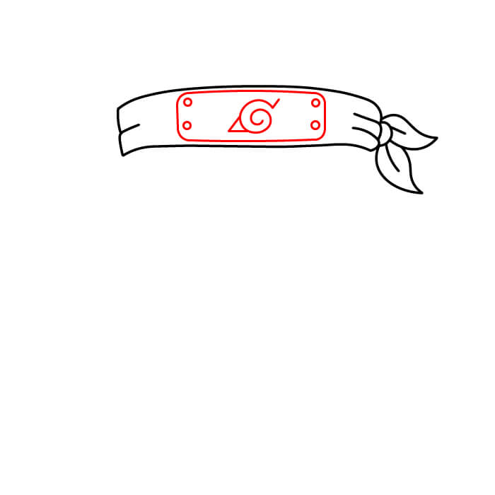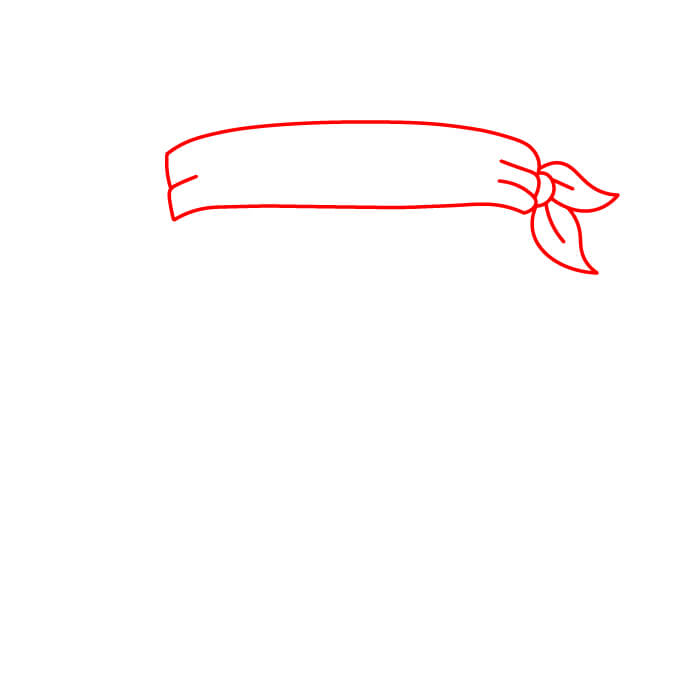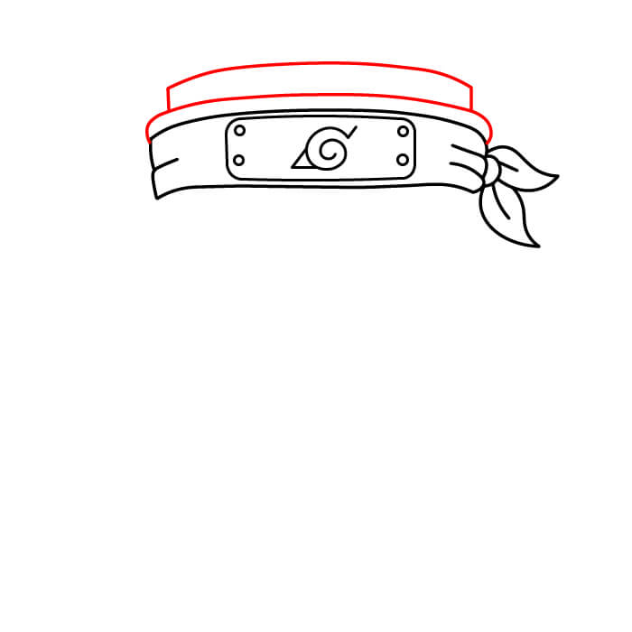 Začněte kresbu vodorovným obdélníkem, který bude představovat přední část čelenky. Na jednom konci (pravé straně) nakreslete malý kruh připomínající uzel a dva pruhy látky směřující ven, jako jednoduchý uvázaný šátek. Toto je základní prvek.
