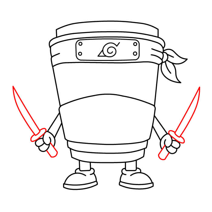 Vybarvěte hlavní tělo kelímku a podrážky bot světle krémovou nebo béžovou barvou. Horní okraj, spodní středový panel a boty vyplňte tmavou, sytě hnědou. Látku čelenky a uzel vybarvěte tmavší hnědou nebo uhlově šedou. Kovovou destičku vybarvěte světle stříbrnošedou s tmavšími detaily pro symbol a nýty. Paže mají stejnou béžovou barvu jako tělo. Čepele kunai jsou světle modrobílé a rukojeti tmavě šedé. Oči ponechte s bílým pozadím a černými zorničkami.