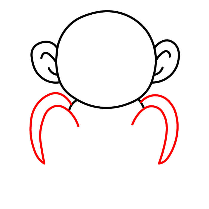 Na levou a pravou stranu hlavy nakreslete dvě velké, zaoblené uši. Dovnitř každého ucha přidejte několik zakřivených čar pro znázornění vnitřních detailů.