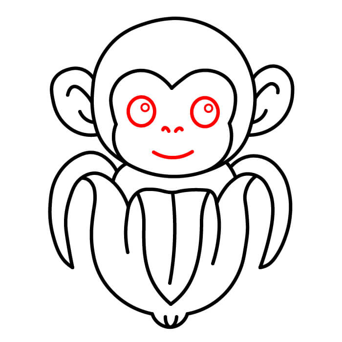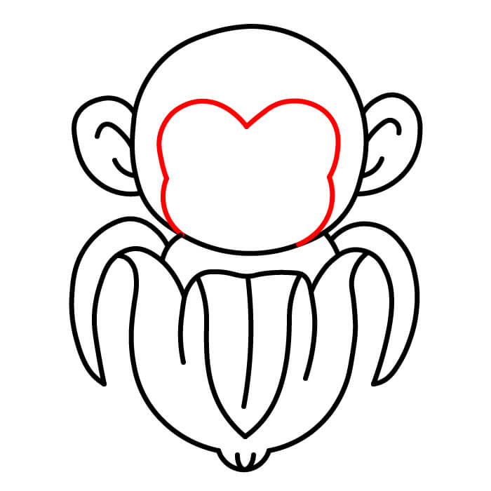 Uvnitř hlavního kruhu nakreslete tvar podobný srdci, který je nahoře špičatý a kolem tváří se zaobluje. Tím vymezíte oblast obličeje opice.