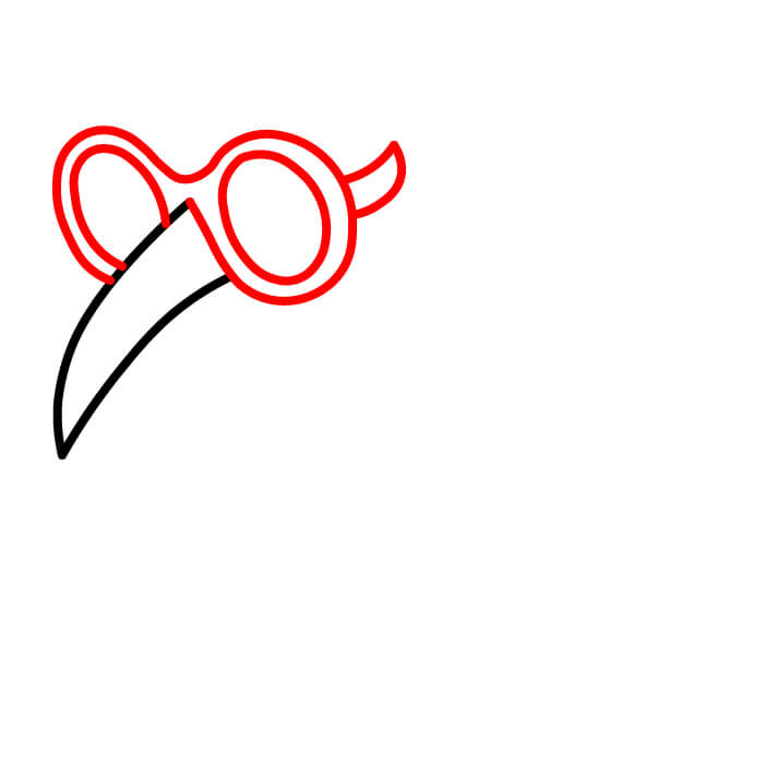 Nakreslete dvě silná kulatá kolečka přímo nad zobákem. Spojte je malým můstkem uprostřed a přidejte pásek směřující dozadu za hlavu.