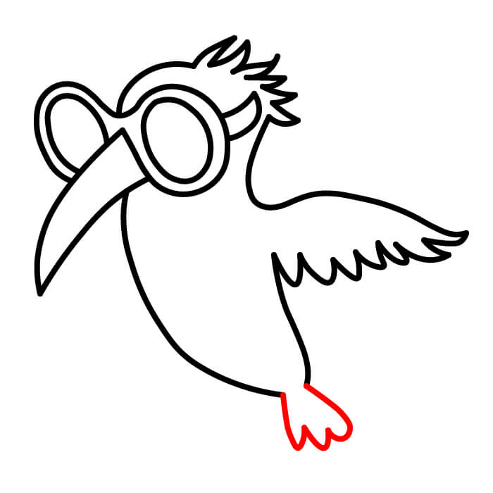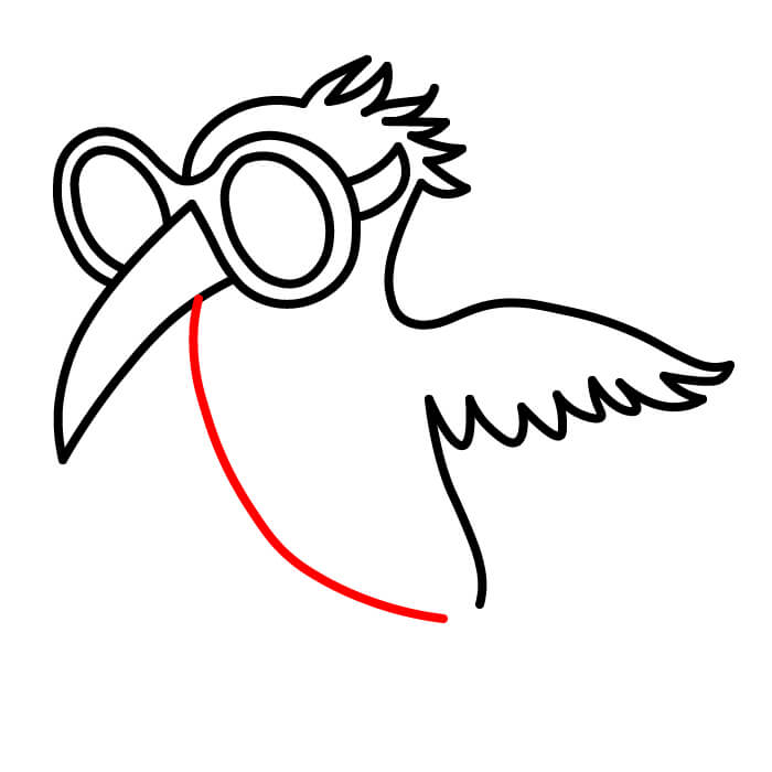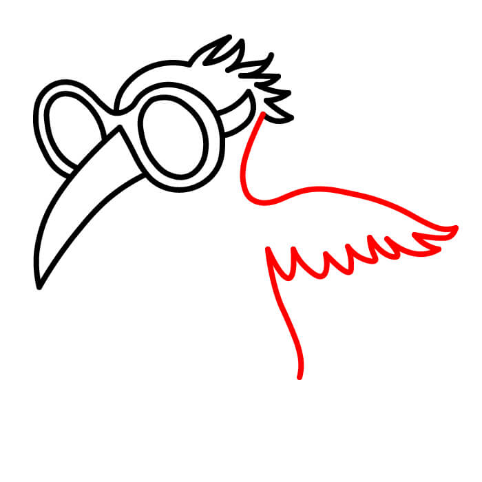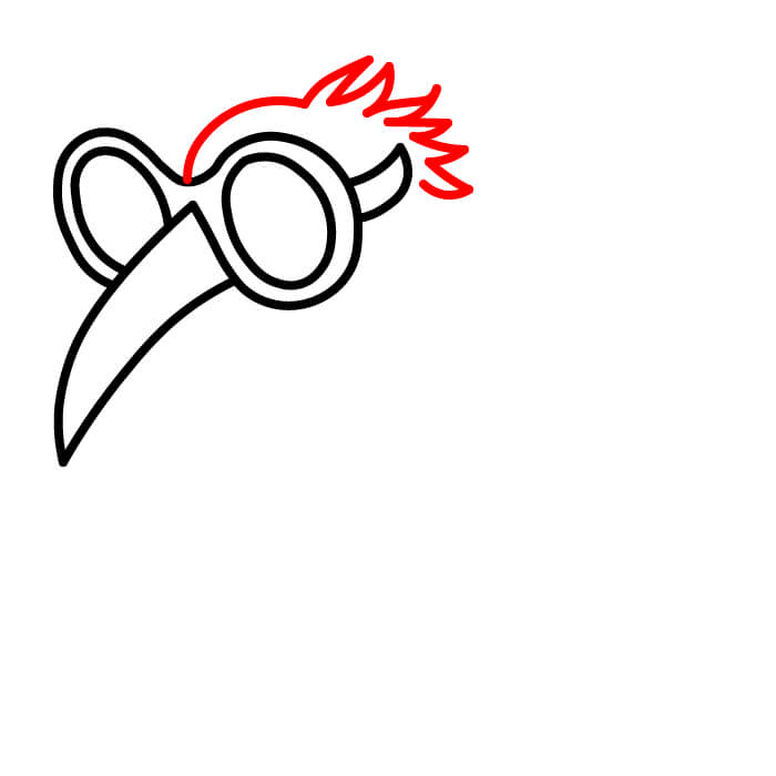 Nad brýlemi nakreslete zakřivenou čáru tvořící vršek hlavy. Přidejte několik ostrých, špičatých pramenů peří směřujících dozadu, které vytvoří výraznou chocholku.