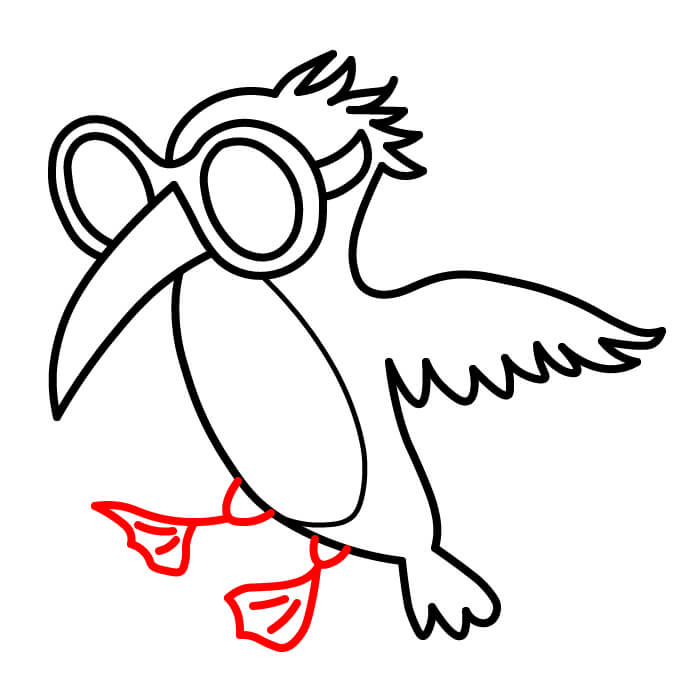 Na spodní části těla přidejte dvě tenké nohy. Na každou nohu nakreslete plovací blány pomocí klikatých čar pro prsty a malých detailních čar uvnitř.