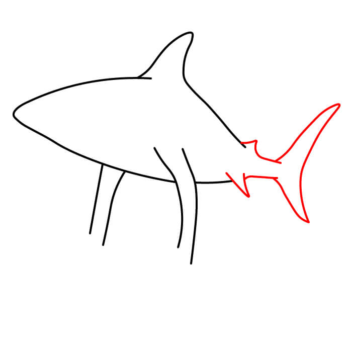 Na zadní části nakreslete velkou ocasní ploutev ve tvaru půlměsíce. Těsně před ocasem přidejte dvě malé ostré ploutve – jednu nahoře a jednu dole.