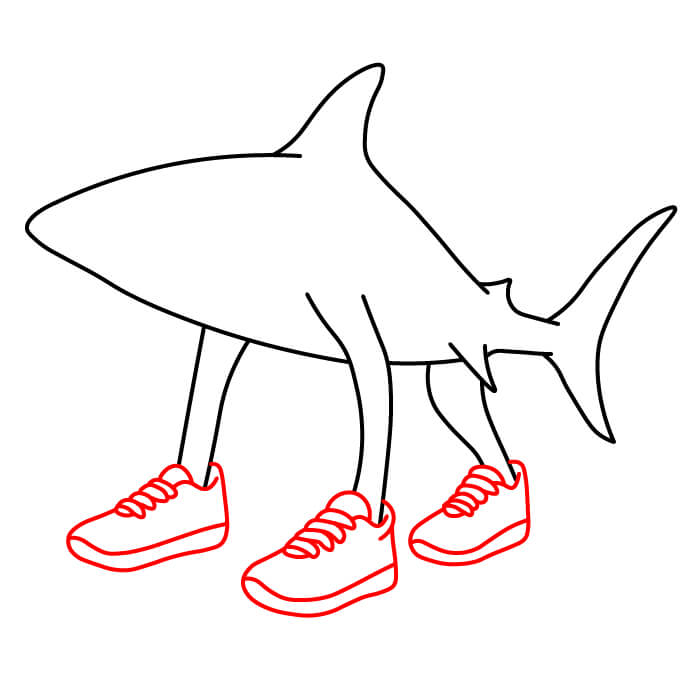 Na spodní část každé nohy nakreslete detailní tenisku. Přidejte tvary pro podrážku, hlavní část boty i tkaničky.