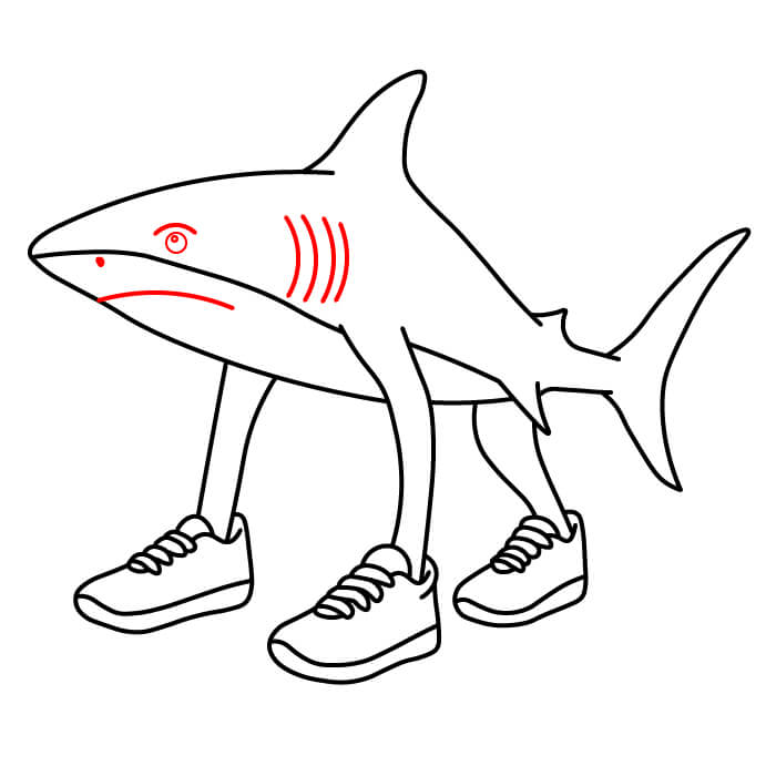 Nakreslete kulaté oko s malou zorničkou a krátkou linku obočí nad ním. Na špičku čenichu přidejte malou tečku jako nosní otvor a dlouhou, dolů zahnutou čáru jako ústa. Nakonec přidejte čtyři zakřivené svislé čáry na boku jako žábry.