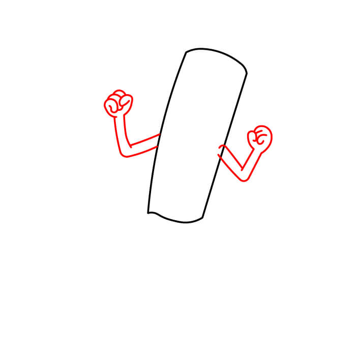 Z dolních rohů hlavní části těla (těsně nad středovým panelem) nakreslete dvě rovné čáry, každou na jednu stranu, směřující šikmo ven a mírně nahoru. Na konci každé paže nakreslete jednoduchou sevřenou pěst. Paže by měly působit jednoduše a kresleně.