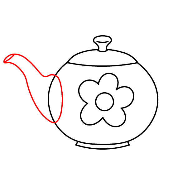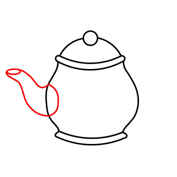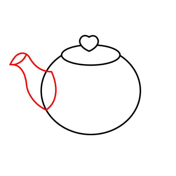 Na levé straně těla konvice nakreslete výlevku. Jedná se o zakřivenou výlevku, mírně ve tvaru písmene S, která se ke konci zužuje.