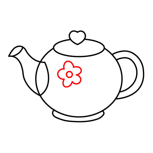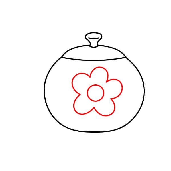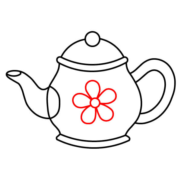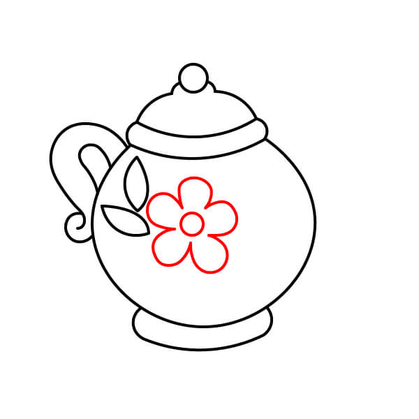 Na tělo konvice nakreslete ozdobnou květinu. Květina má uprostřed malý kruh a pět kulatých okvětních lístků.