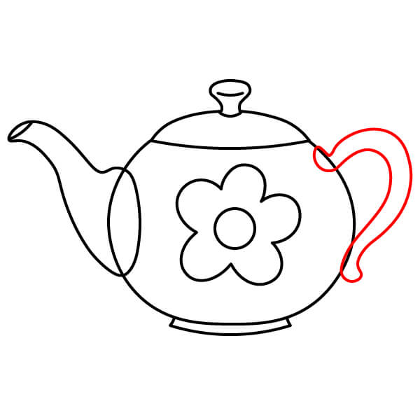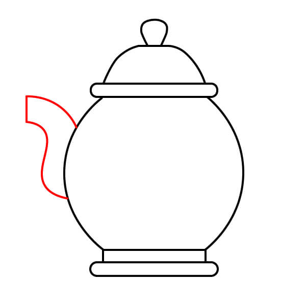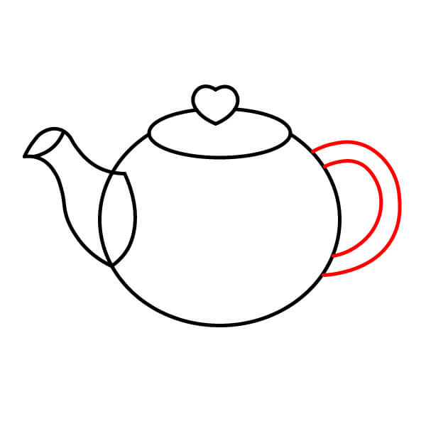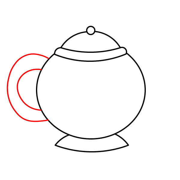 Na levé straně těla konvice nakreslete rukojeť. Mělo by to být tvar C tvořený dvěma soustřednými křivkami.