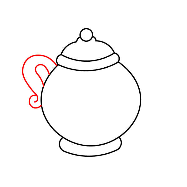 Na levé straně těla konvice nakreslete rukojeť. Tato rukojeť má elegantní tvar písmene C s malou ozdobnou spirálkou nebo závitem ve spodní části.