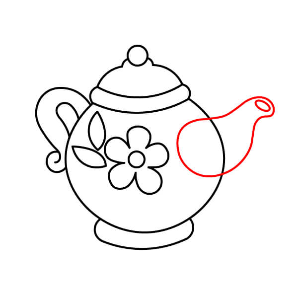 Na levé straně těla konvice nakreslete výlevku. Tato výlevka je krátká, u základny široká a zakřivená směrem ven s mírně otevřeným koncem.