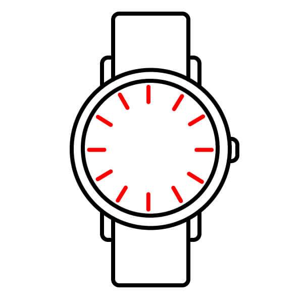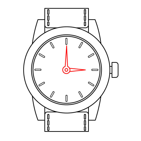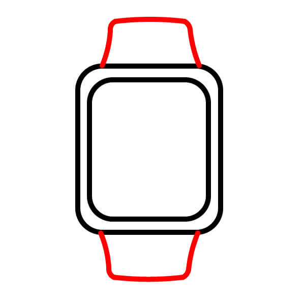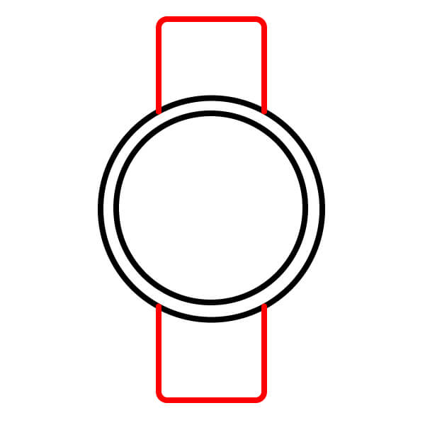 Nakreslete dva obdélníkové proužky vyčnívající z horních a spodních výstupků. Toto je řemínek hodinek.