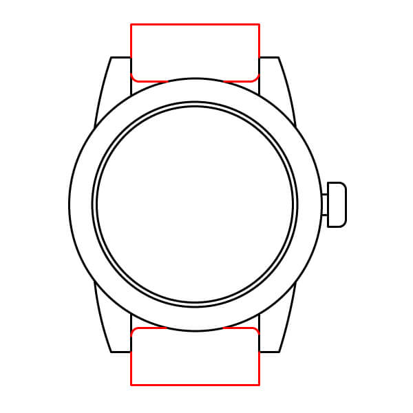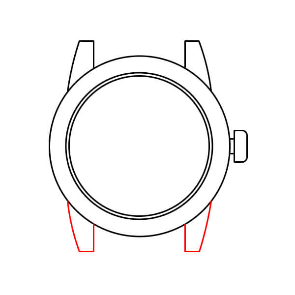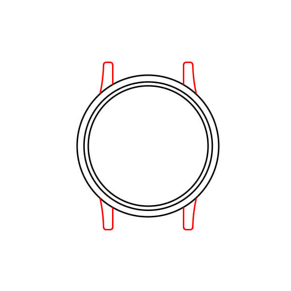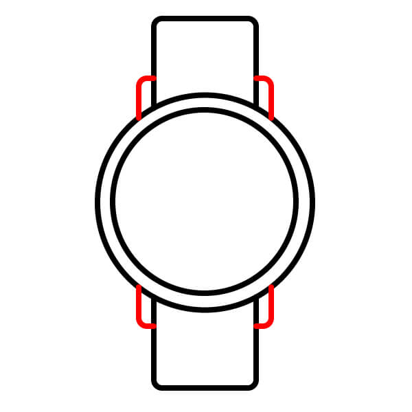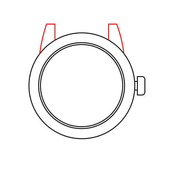 Nakreslete čtyři malé, zužující se obdélníky (dva nahoře a dva dole) připevněné k hlavnímu pouzdru hodinek. Jedná se o výstupky, které spojují pouzdro s řemínkem.