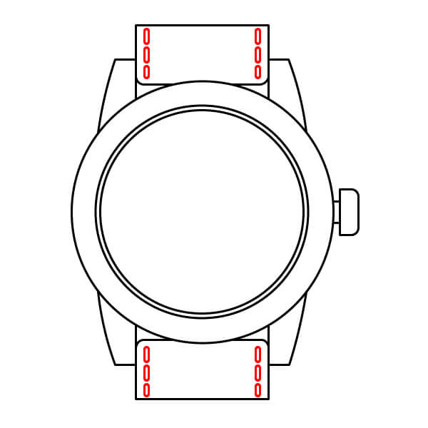 Nakreslete čtyři malé, zakřivené, mírně obdélníkové tvary spojující řemínek s hlavním pouzdrem (dva nahoře a dva dole). To jsou výstupky.