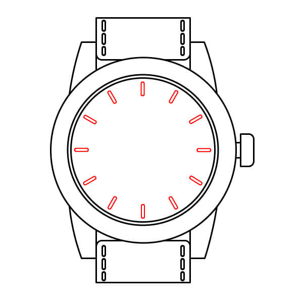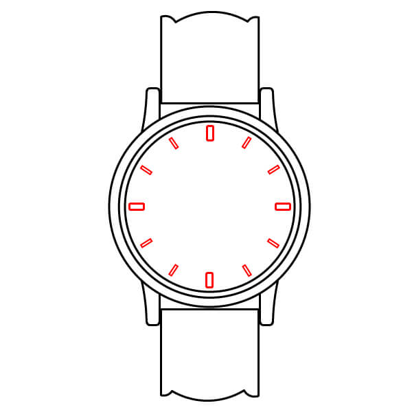 Na ciferník hodinek (vnitřní kruh) nakreslete dvanáct malých obdélníků rovnoměrně rozmístěných po obvodu. Jedná se o hodinové značky. Všimněte si, že hodinové značky ve 12, 3, 6 a 9 hodinách jsou o něco větší nebo jsou znázorněny dvěma rovnými čarami.
