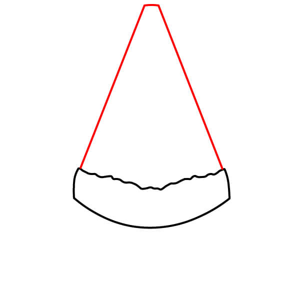 Nyní přidejte horní trojúhelníkovou část plátku melounu. Nakreslete dvě rovné čáry, které vedou nahoru a dovnitř z konců vlnité horní čáry z kroku 1. Tyto čáry se setkají v jednom bodě nahoře.