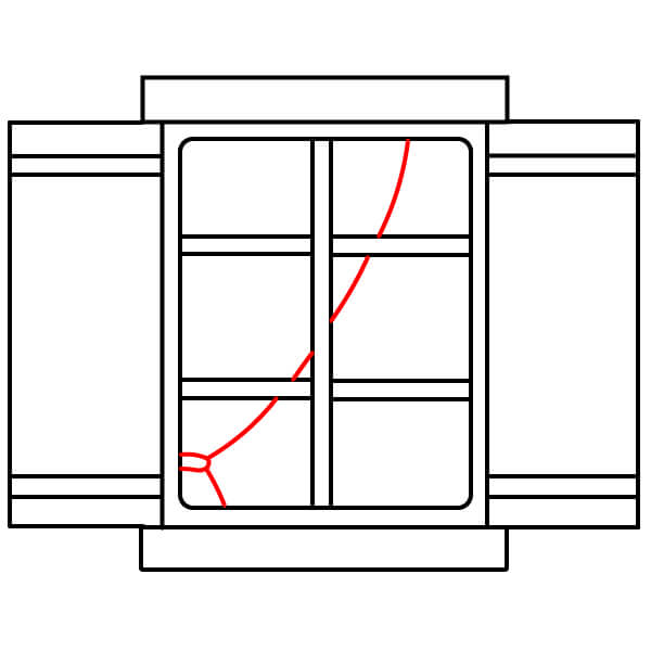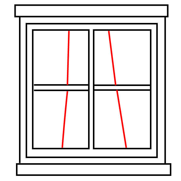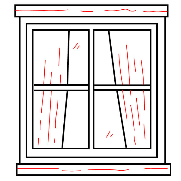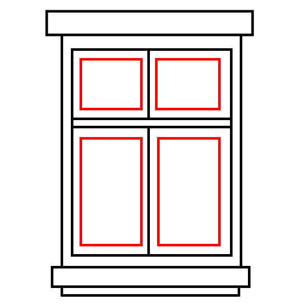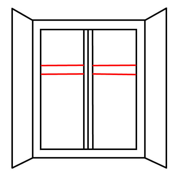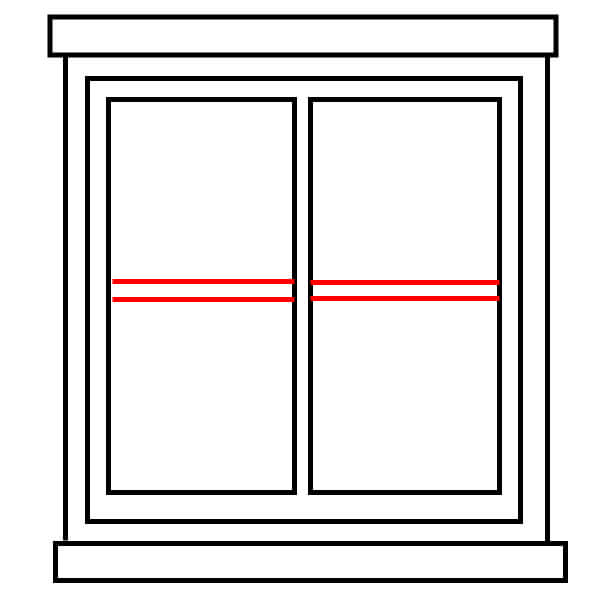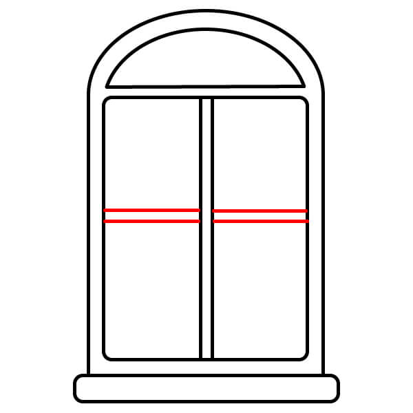 Nakreslete dva páry červených vodorovných čar uprostřed okna, čímž vytvoříte dvě vodorovné dělicí čáry v každé okenní tabuli. Tím se okno rozdělí celkem na šest tabulí.