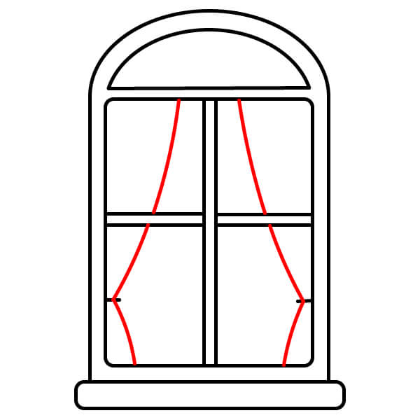 Nakreslete záclony. Na horní dvě tabule nakreslete dvě vlnovky začínající shora a zakřivené dovnitř směrem ke středu. Na spodní dvě tabule nakreslete dvě vlnovky začínající od stran a zakřivené dovnitř, které vytvoří efekt vázání ve spodní části okna.