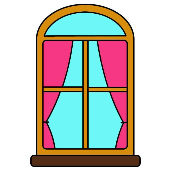 Nakonec vybarvěte kresbu. Celý rám okna vybarvěte hnědě. Horní půlkruhové okno vybarvěte světle modrou barvou. Horní dvě záclony vybarvěte jasně růžovou a spodní dvě záclony světlejší modrou barvou. A to je vše.