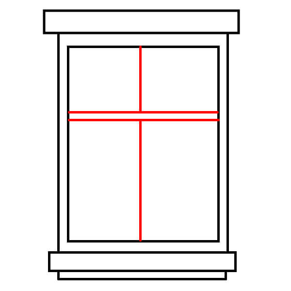 Nakreslete vodorovnou a svislou čáru protínající se uprostřed vnitřního rámu okna. Tato čára rozděluje okno na čtyři rámy.