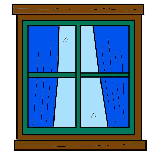 Nakonec vybarvěte kresbu. Okenice vybarvěte světle hnědou barvou. Hlavní rám okna vybarvěte hnědou nebo béžovou barvou. Horní dvě tabulky vybarvěte světle zelenou barvou a spodní dvě tabulky světle modrou barvou.