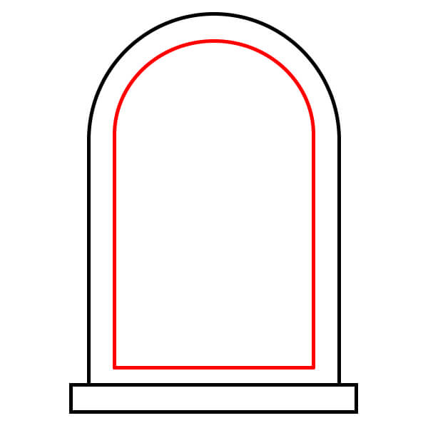 Na obdélníku z kroku 1 nakreslete svislou čáru směřující nahoru. Spojte horní část svislé čáry s červeným půlkruhem a vytvořte oblouk. Tím vytvoříte základní tvar okna.