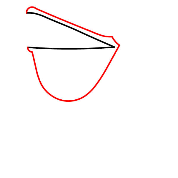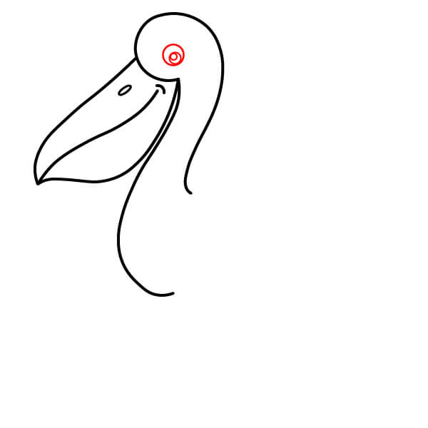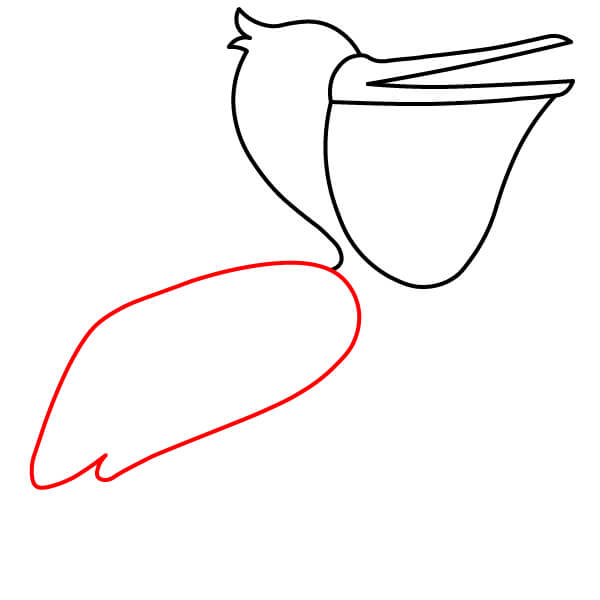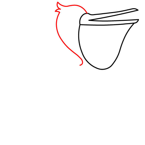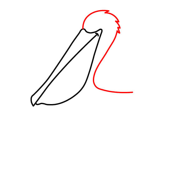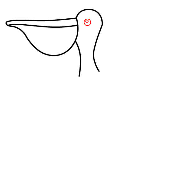 Začněte kreslením typického dlouhého zobáku s velkým vakem směřujícím dolů pod spodní čelistí. Horní část zobáku by měla mít dělící linii.