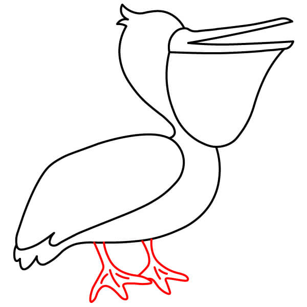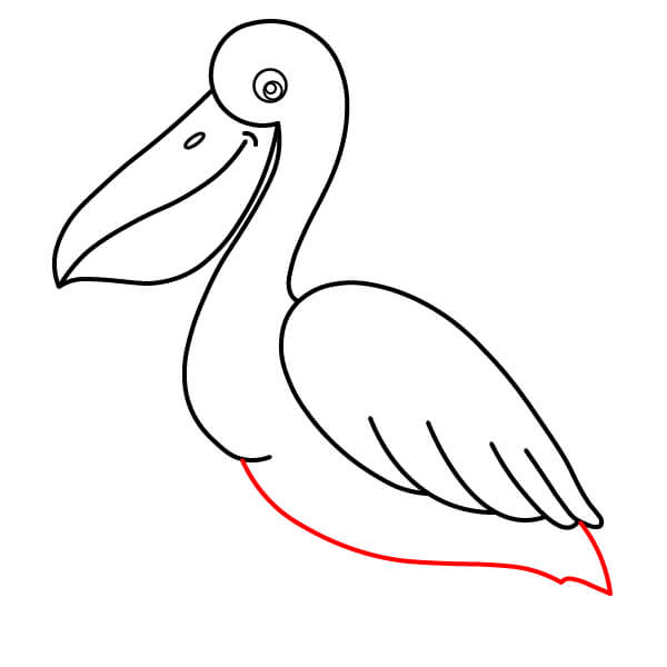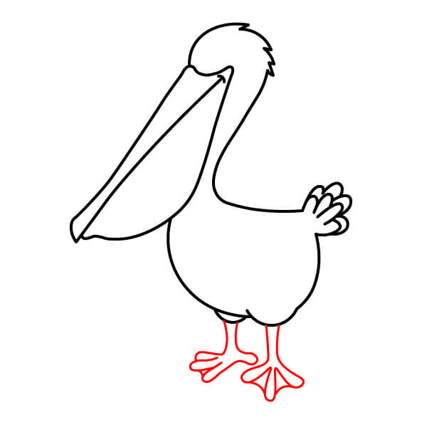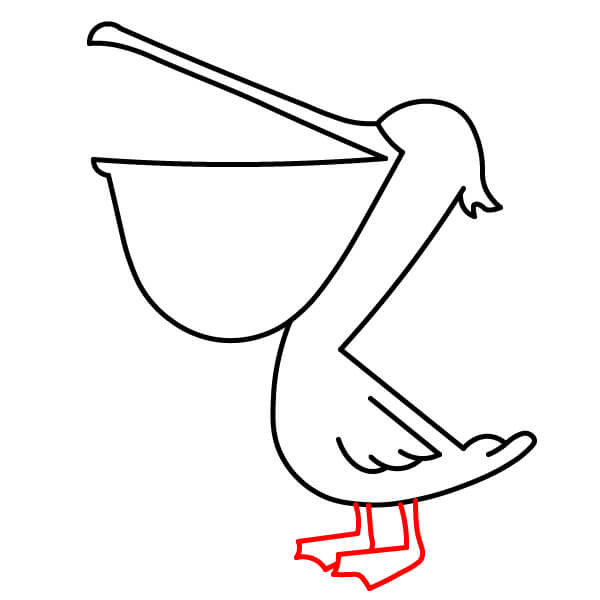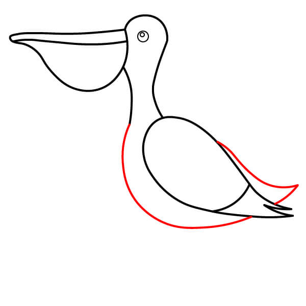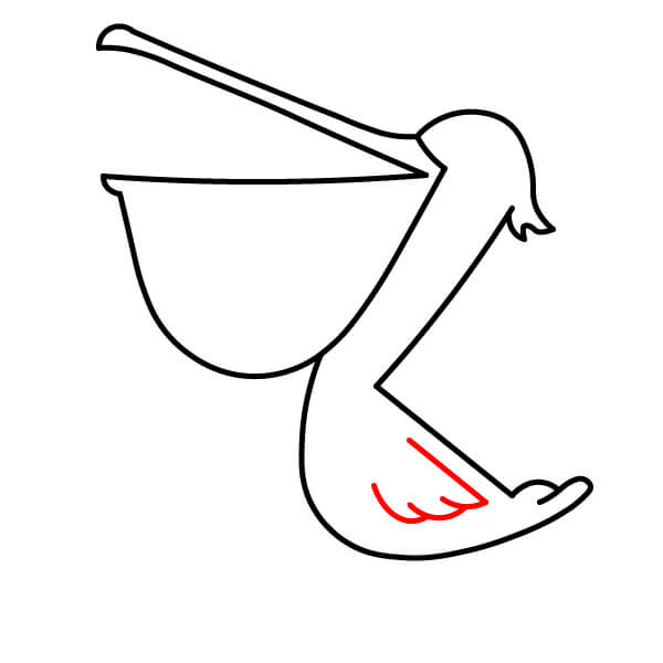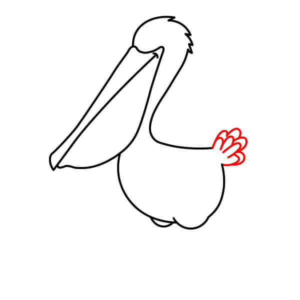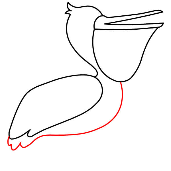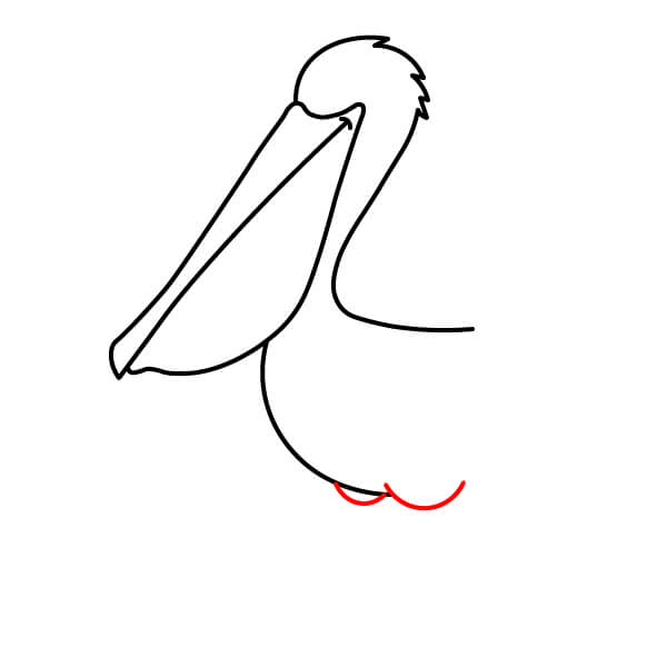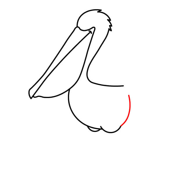 Pod tělem nakreslete dvě malé zaoblené křivky. Ty představují horní část nohou/chodidel, protože pelikán je nakreslen v odpočinkové nebo sedící poloze.