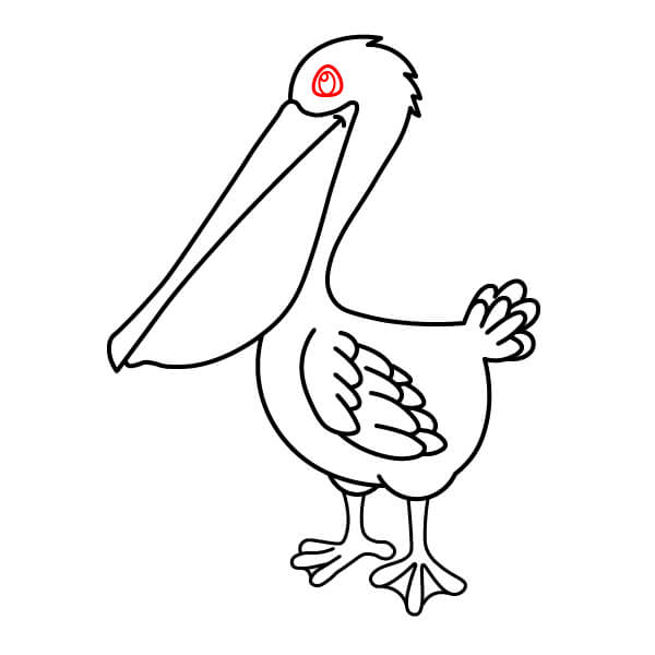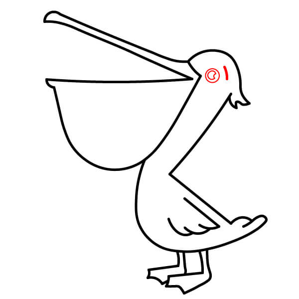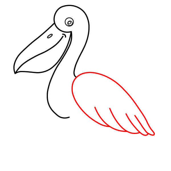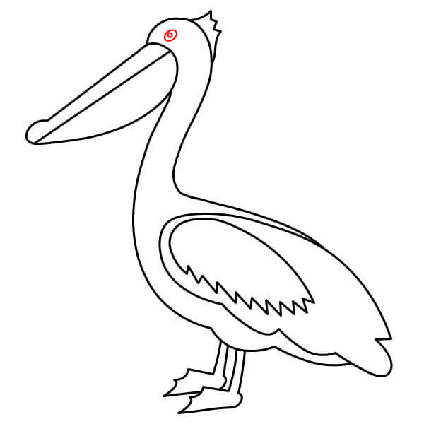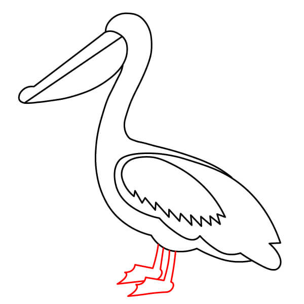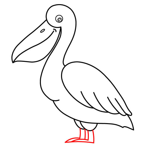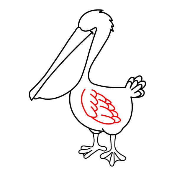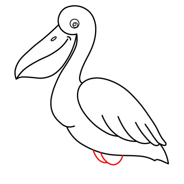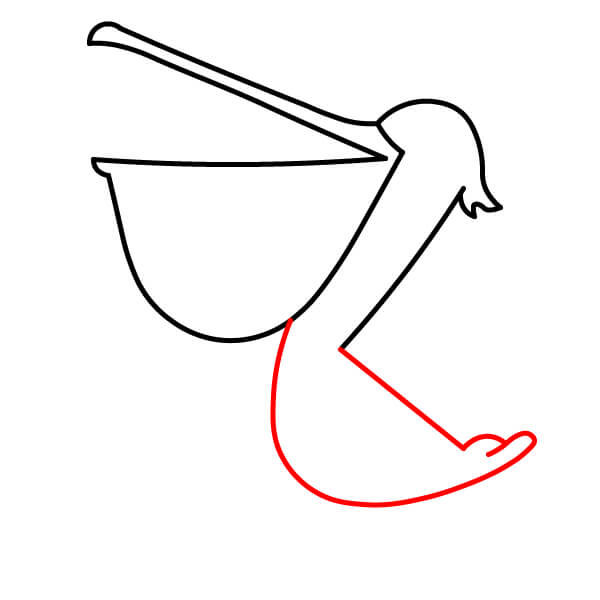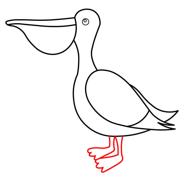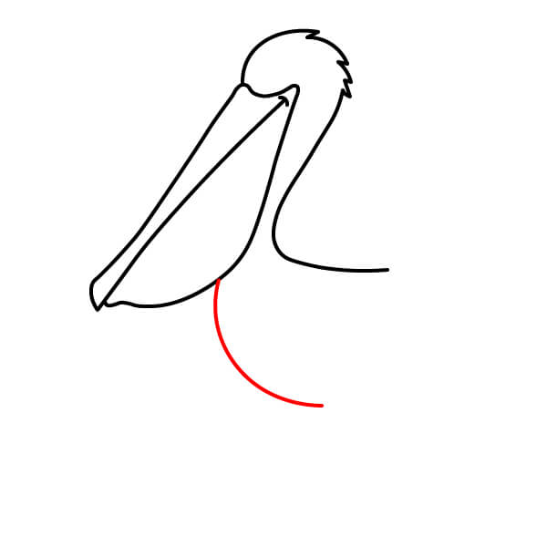 Pod tělem nakreslete dvě malé zaoblené křivky. Ty představují horní část nohou/chodidel, protože pelikán je nakreslen v odpočinkové nebo sedící poloze.