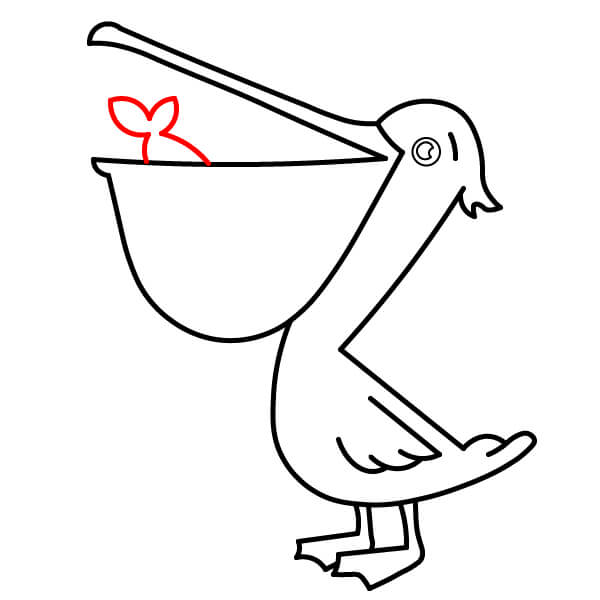 Do otevřeného vaku nakreslete malý, jednoduchý tvar ryby. Může to být základní ovál s ocasní ploutví, který naznačuje, že pelikán právě chytil svou kořist.