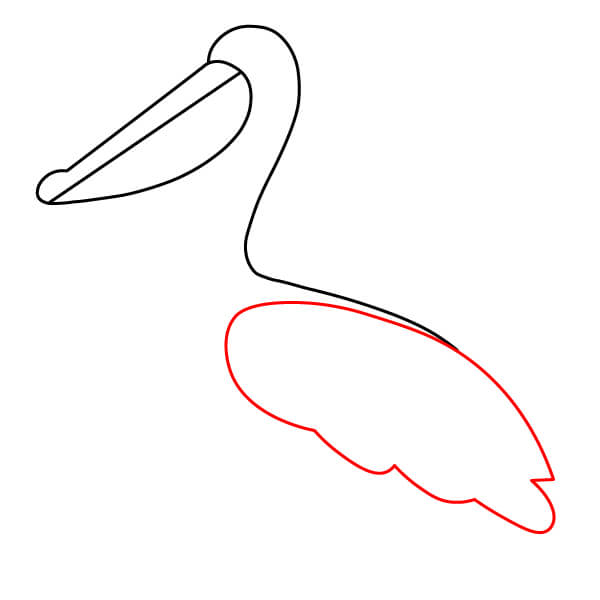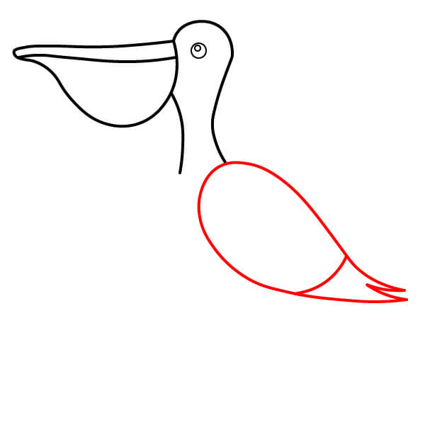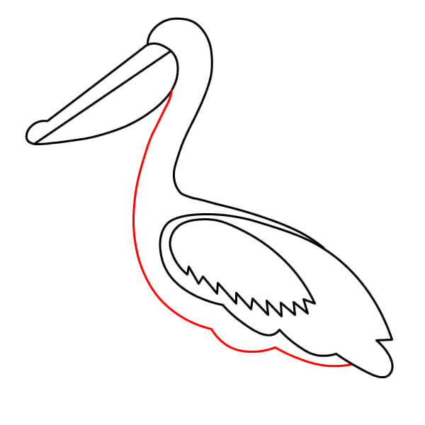 Od spodní části krku (kde se spojuje s vakem) nakreslete dlouhou, plynulou zakřivenou čáru směrem dolů a dozadu, čímž vytvoříte zaoblené tělo pelikána. Na konci přidejte malý špičatý tvar pro ocas.