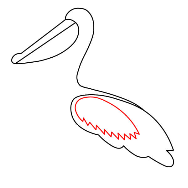 Uvnitř těla nakreslete oválný tvar představující křídlo. Podél spodního okraje tohoto oválu přidejte klikatou čáru pro naznačení struktury peří.