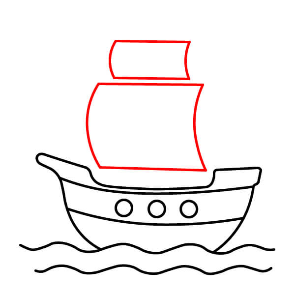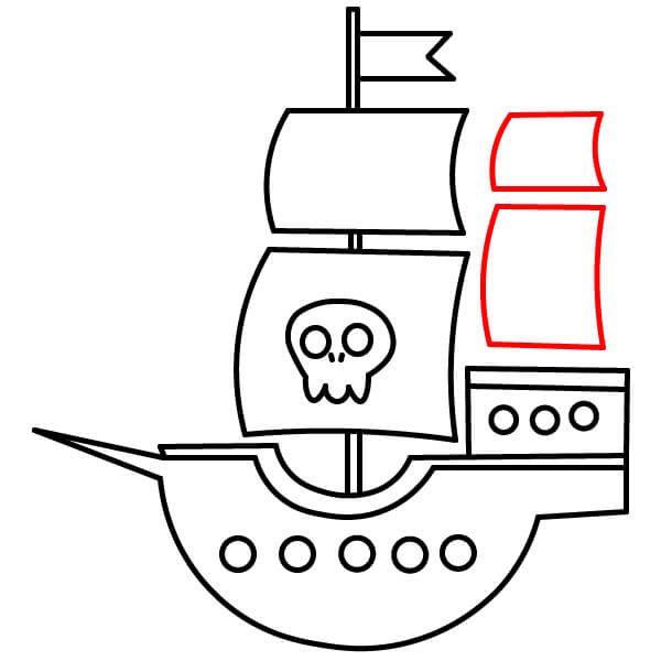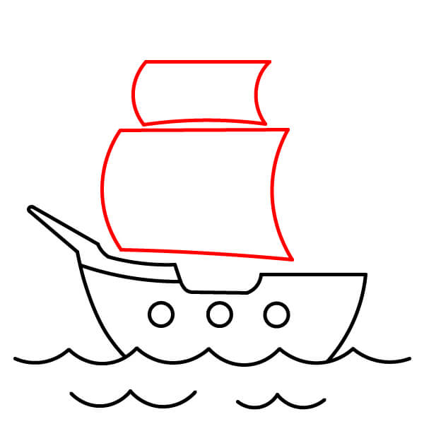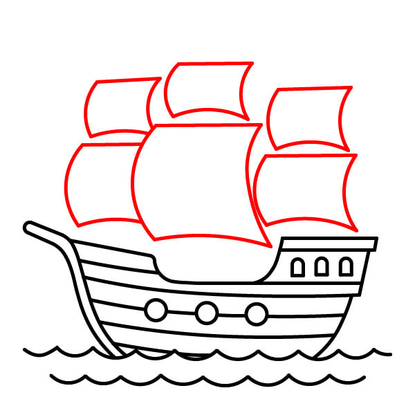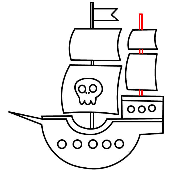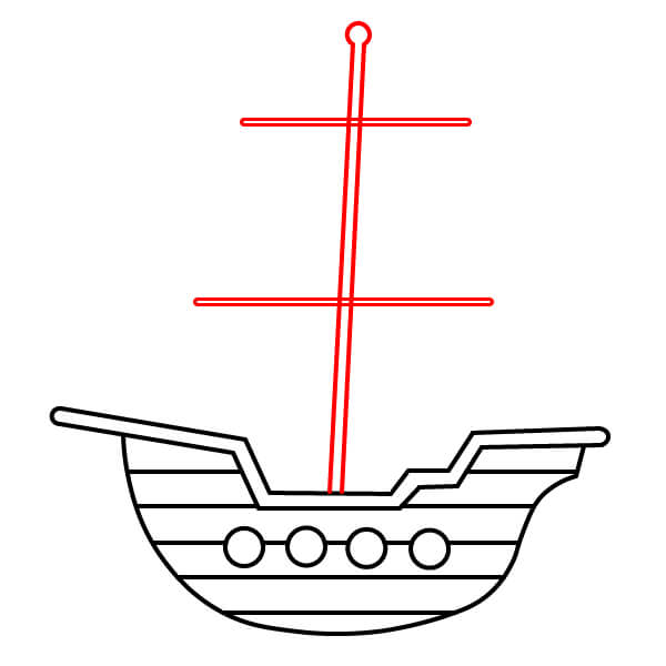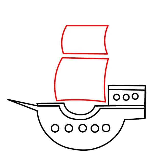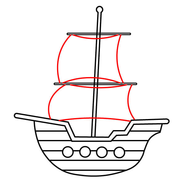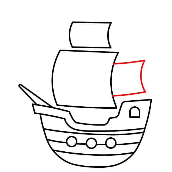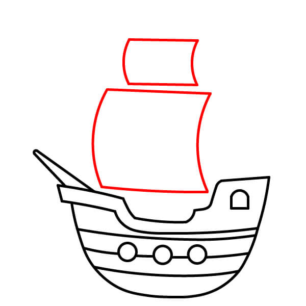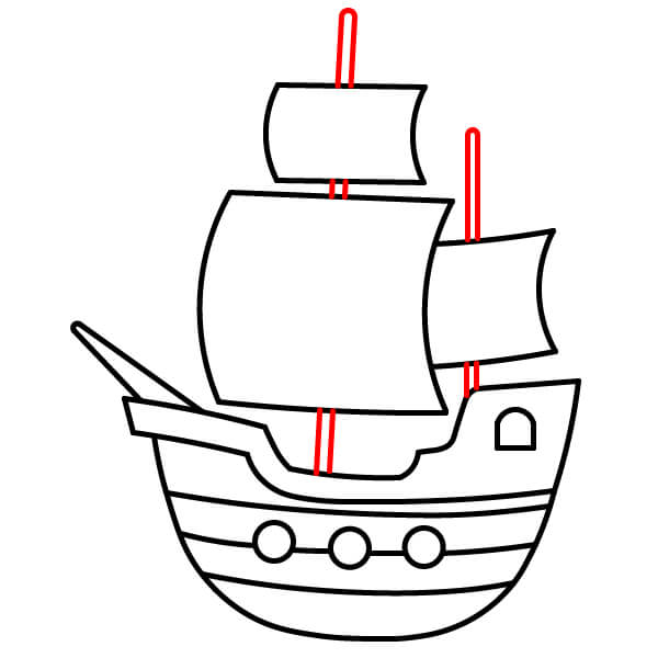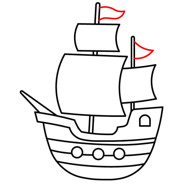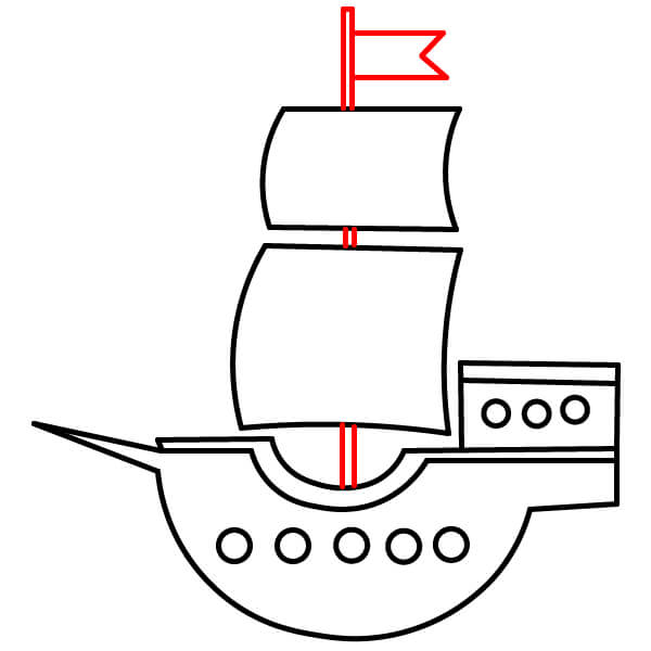 Nakreslete dva svislé stěžně procházející plachtami a spojující se s palubou. Přidejte ráhna, která podpírají plachty, a na vrchol vyššího stěžně nakreslete stožár s červenou vlajkou.