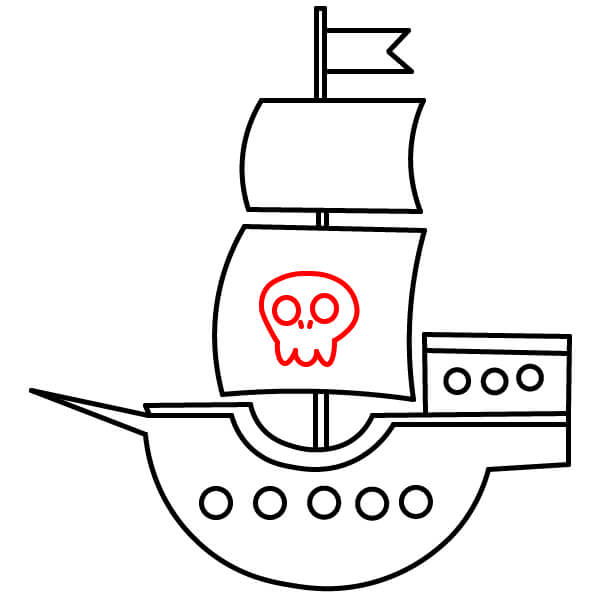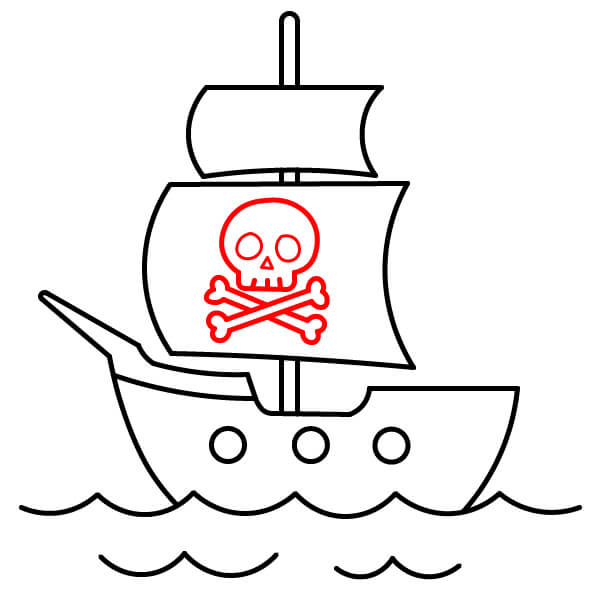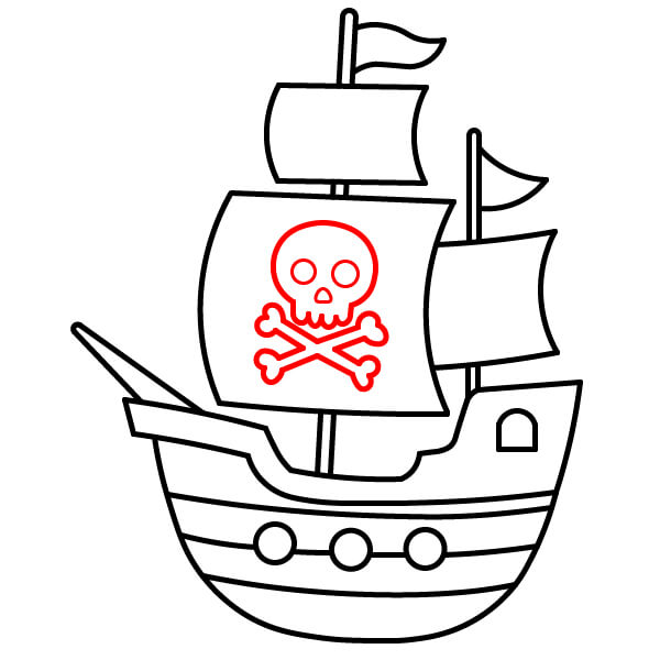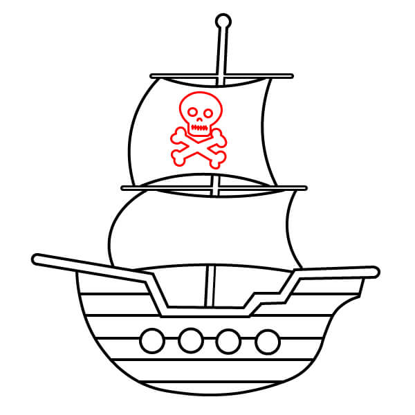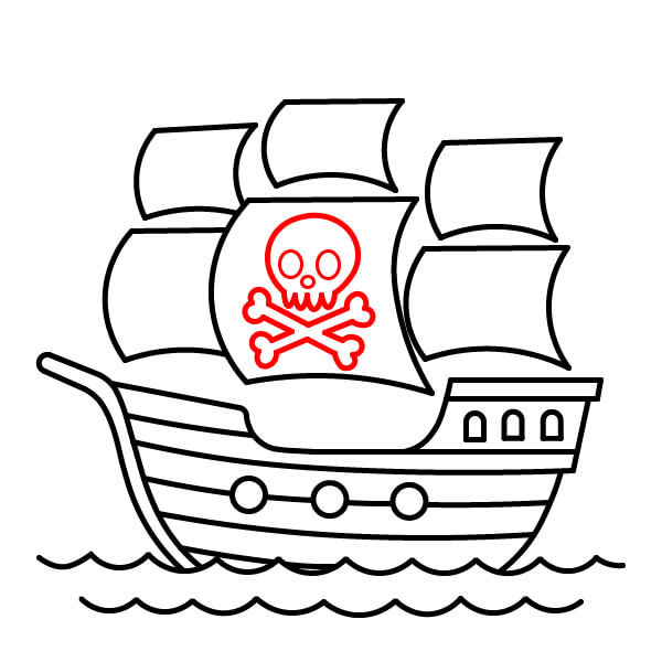 Vybarvěte loď. Použijte odstíny hnědé pro dřevěný trup a stěžně, černou barvu pro plachty, bílou pro lebku a zkřížené kosti a červenou pro horní vlajku.