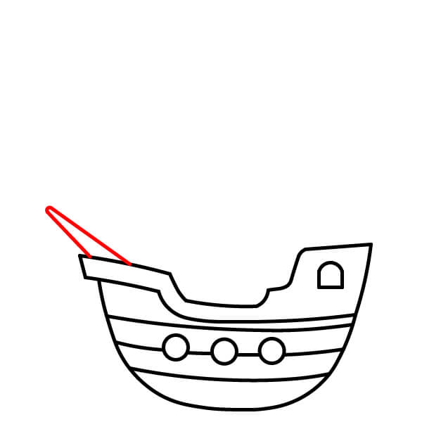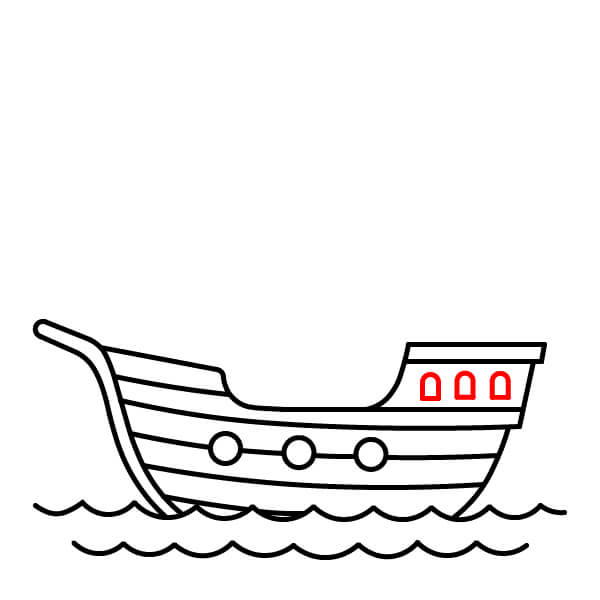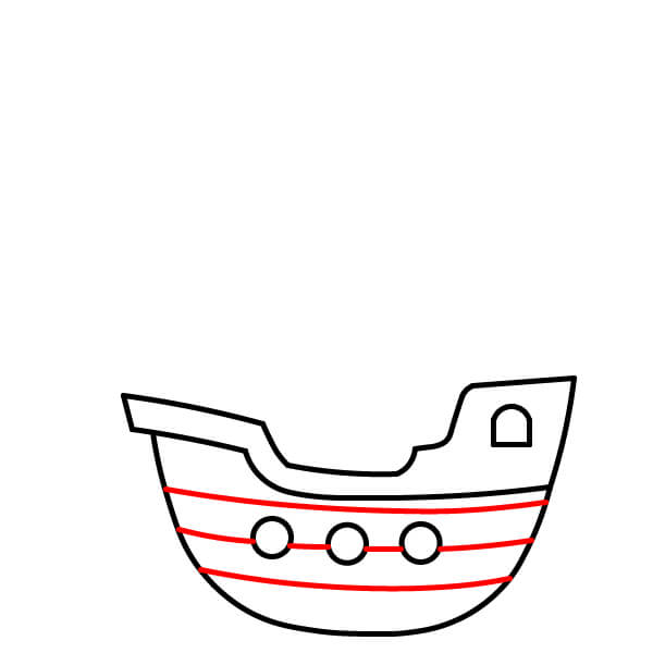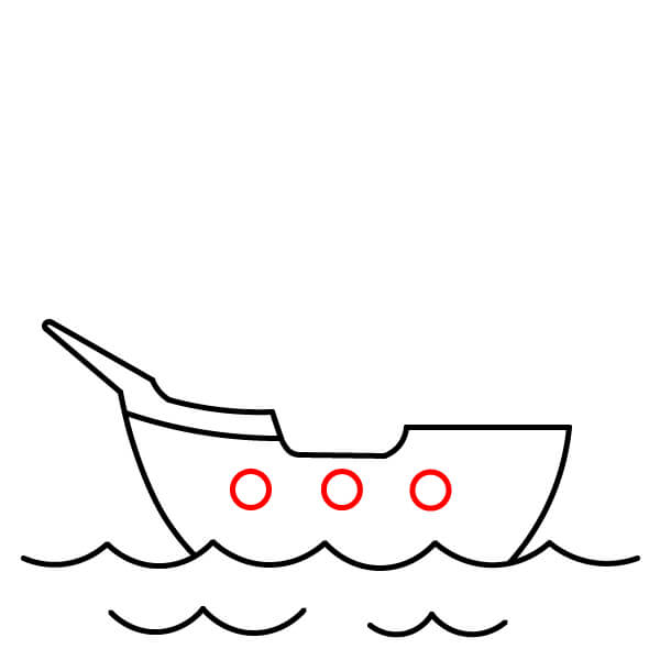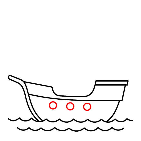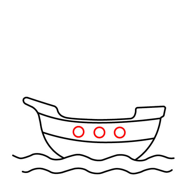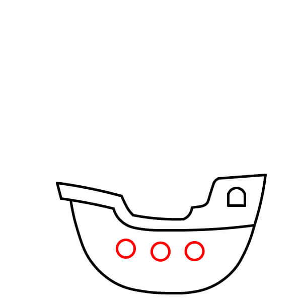 Nakreslete tři malé kruhy na boku trupu pod linií paluby. Budou to lodní okénka (nebo otvory pro děla).