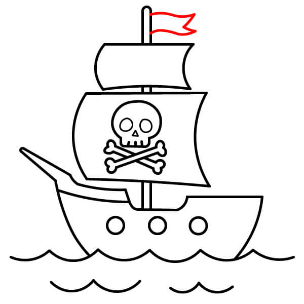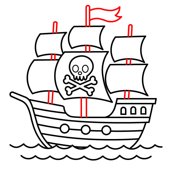 Na úplný vrchol obou stěžňů nakreslete malé trojúhelníkové vlajky. Tím je kresba kreslené pirátské lodi dokončena.