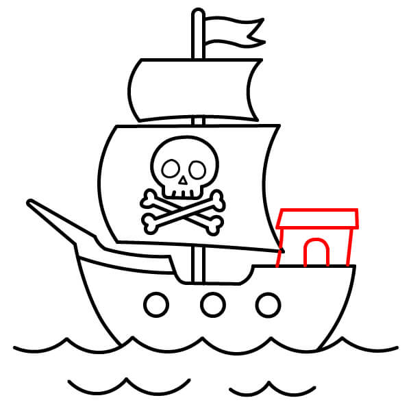 Na zádi lodi nakreslete malou obdélníkovou kajutu. Měla by mít obloukový otvor představující dveře nebo okno a plochou střechu.