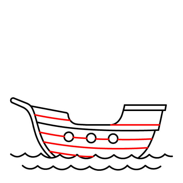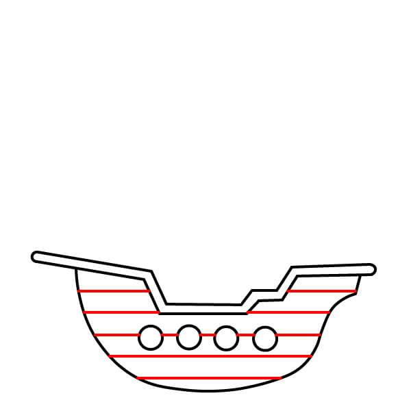 Nakreslete několik vodorovných čar přes celý trup, aby znázorňovaly dřevěná prkna a pruhování na vnější části lodi.
