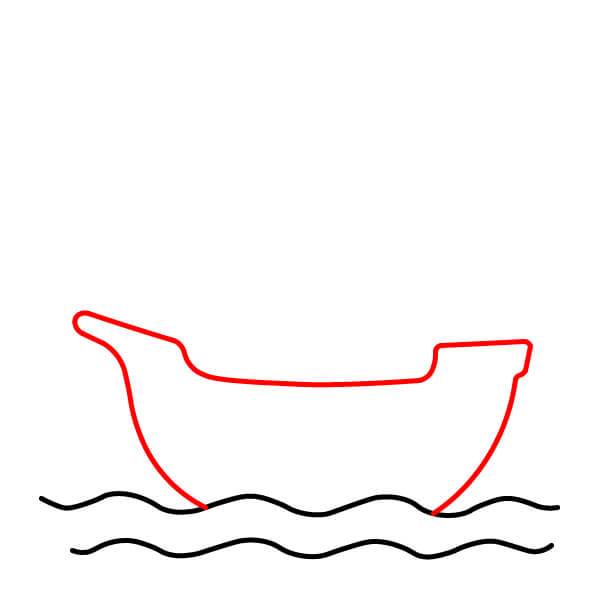 Nakreslete základní obrys trupu lodi. Měl by mít zaoblený tvar podobný misce a měl by spočívat na vlnách, které jste nakreslili v kroku 1. Přední část (příď) by měla být mírně zvednutá a zadní část (záď) by měla být o něco vyšší a více hranatá.