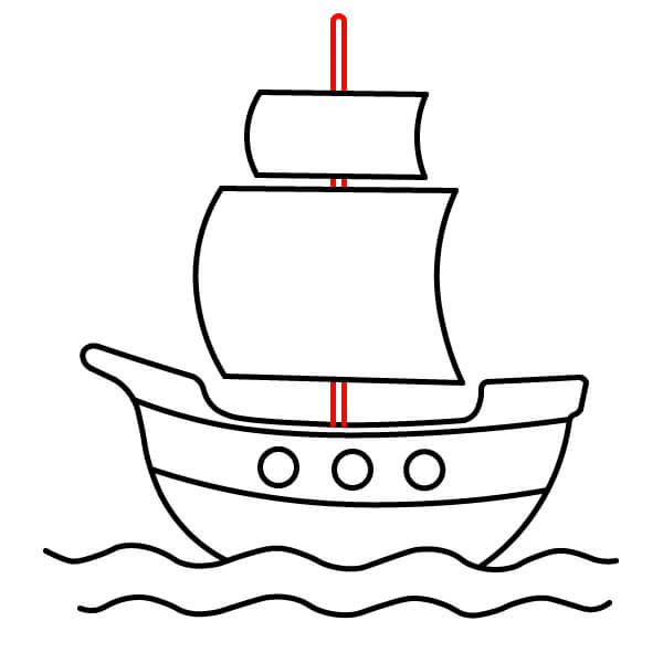 Nakreslete svislou čáru vycházející ze středu trupu lodi směrem nahoru, která prochází oběma plachtami. To je stěžeň. Přidejte malou vodorovnou čáru, která ukazuje, kde je připevněna horní plachta.