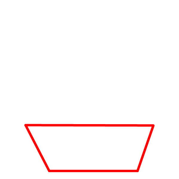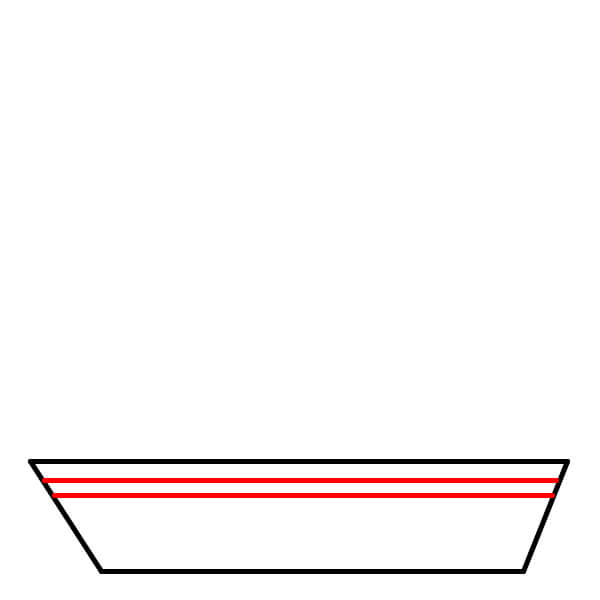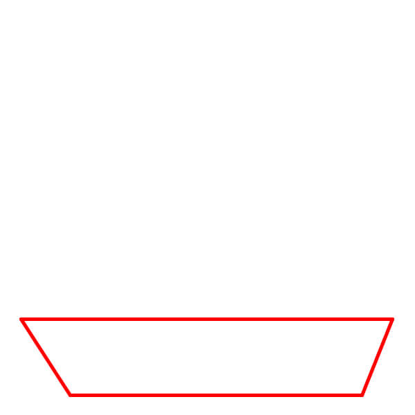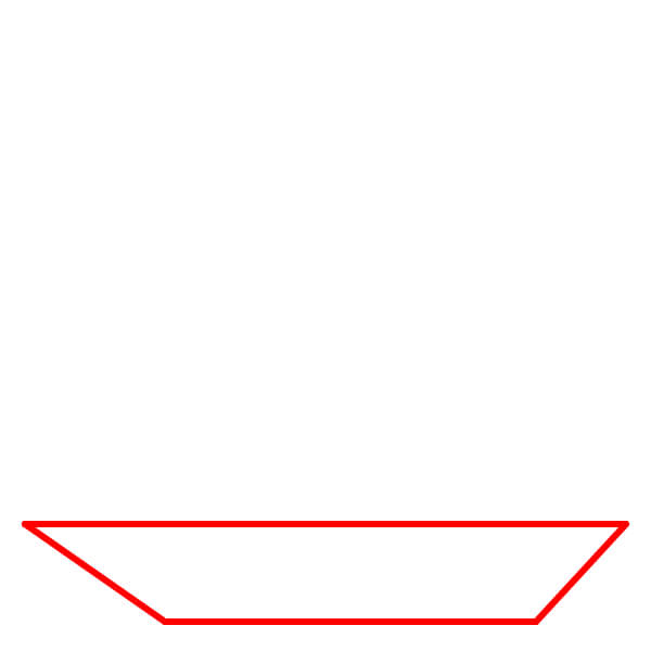 Krok 1: Nakreslete trup lodi. Začněte vodorovnou čarou, z jejích konců veďte dvě šikmé čáry směrem dolů a dovnitř a dole je spojte kratší vodorovnou čarou.