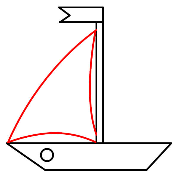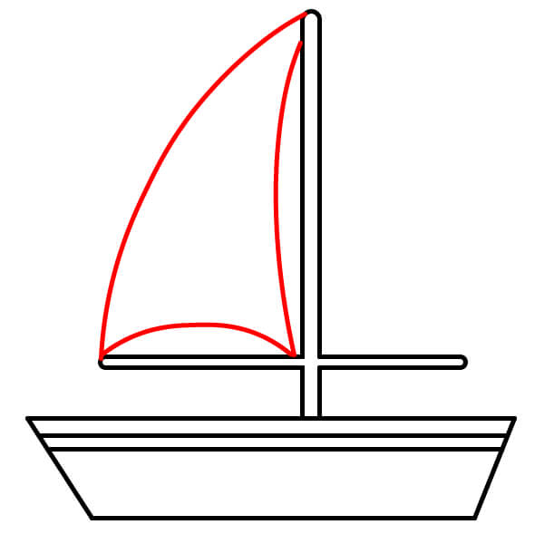Krok 4: Nakreslete zakřivenou čáru od vrcholu stěžně k přednímu konci vodorovné čáry. Poté ji další zakřivenou čarou spojte zpět se stěžněm, čímž vytvoříte první plachtu.