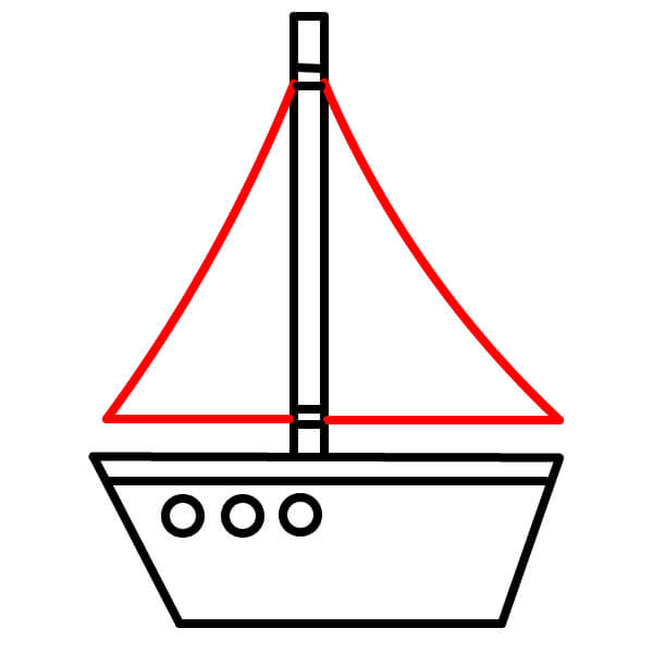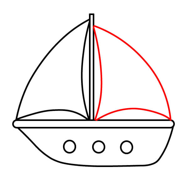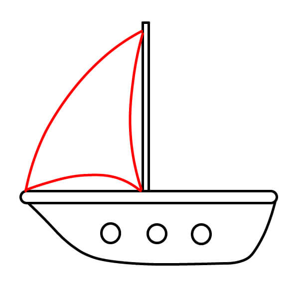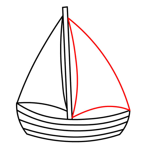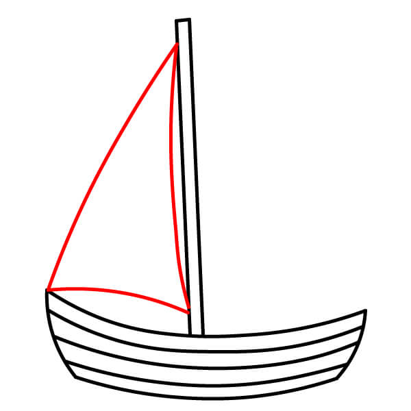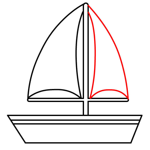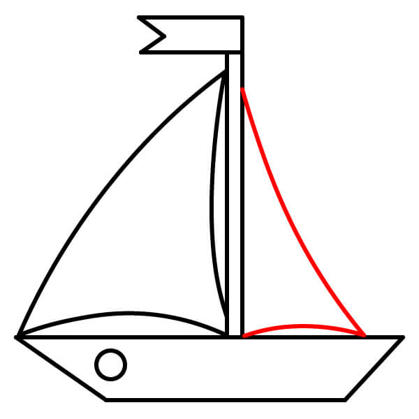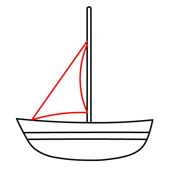 Krok 5: Za stěžněm nakreslete druhou plachtu. Také bude trojúhelníková, její horní vrchol bude na vrcholu stěžně a spodní mírně zakřivená linie se připojí k zadní části trupu lodi.